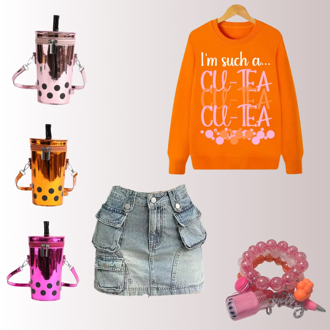Steep in style with our 'Cu-Tea' sweatshirt! This bright and bubbly number is perfect for your little fashionista to show off her playful side. Fit for all-day comfort and makes a cheeky statement with its punny charm. For a totally tea-rific ensemble, pair it with our boba tea crossbody bag and Cu-Tea bracelet set. #StyleSteepedInFun #CuTeaVibes