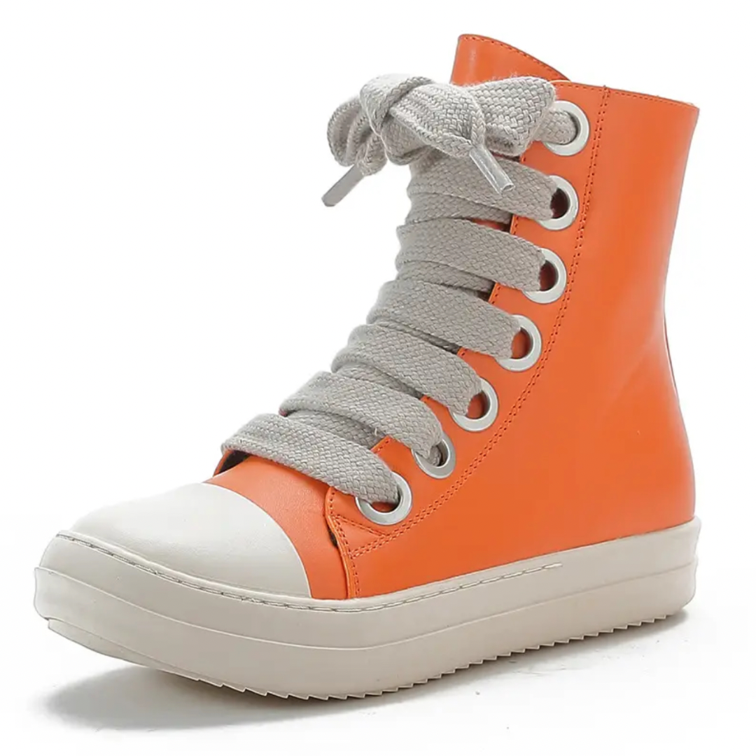 Introducing our Kids' PU Leather Hightop Canvas Sneakers – a perfect blend of simplicity and style for the little trendsetters! Available in vibrant black, pink, orange, and red, these sneakers are designed to make a statement with every step.